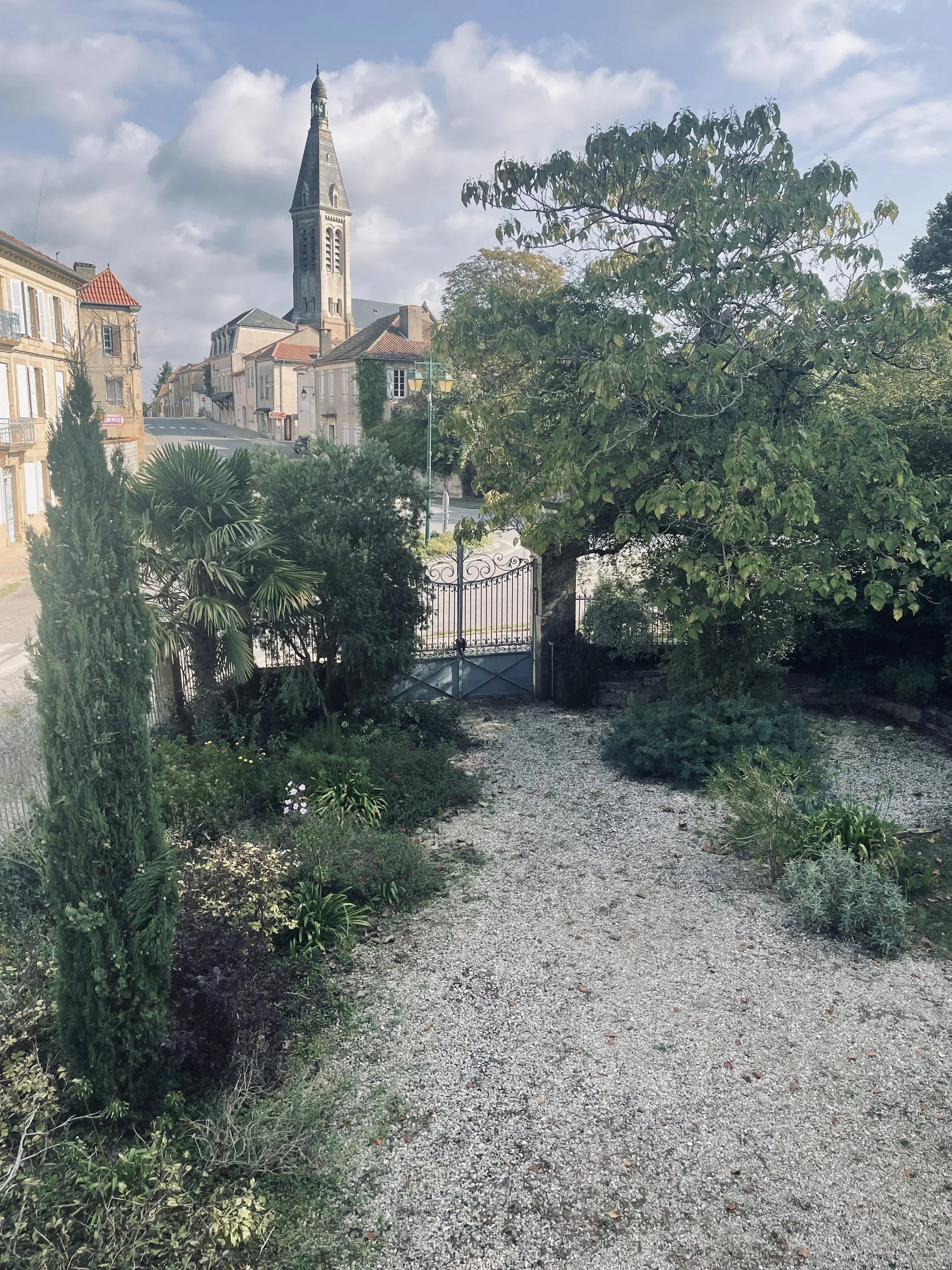A gravel path bordered by various plants and trees, leading to a gate with a city street and historic church tower in the background. View fullsize