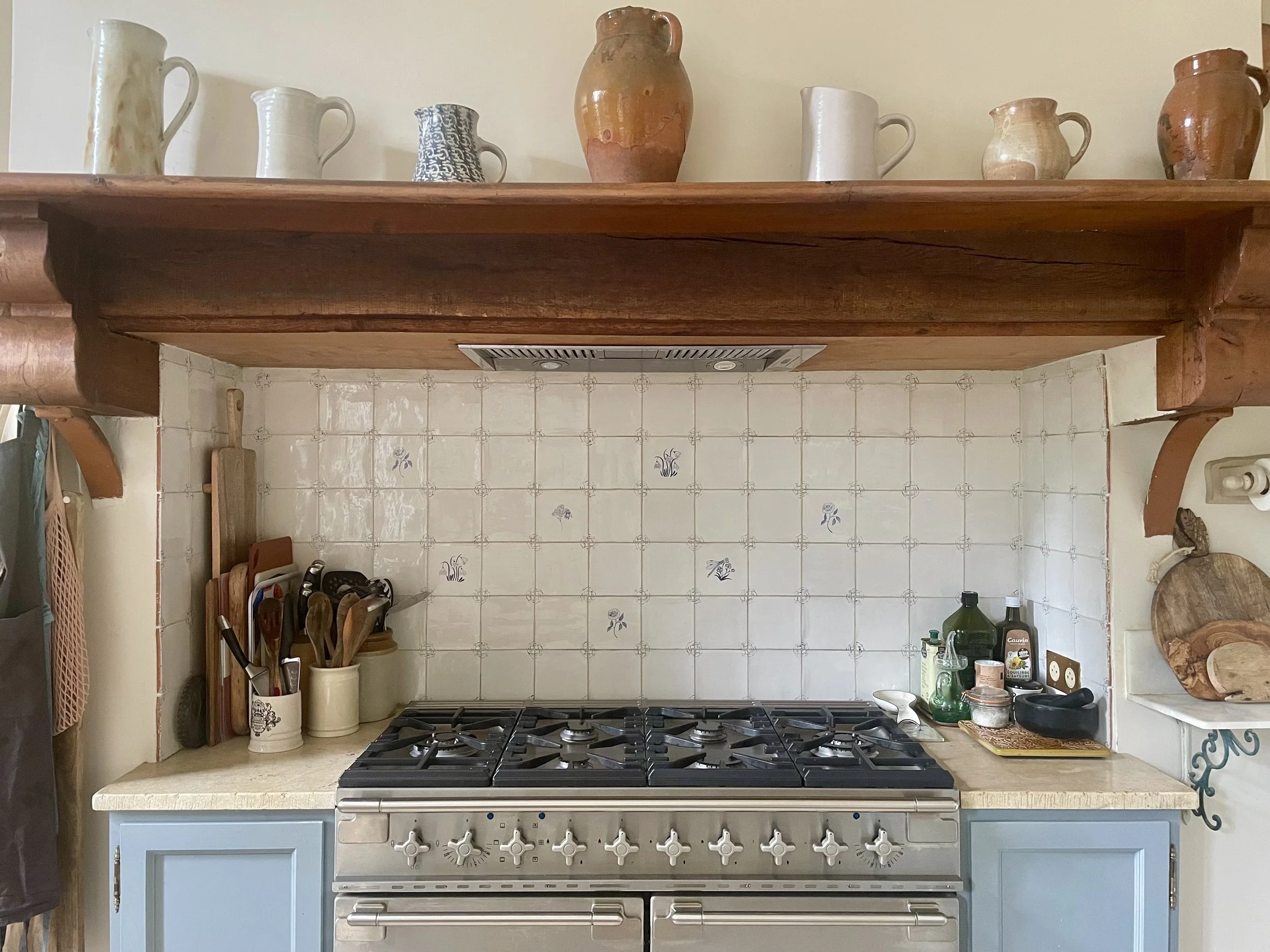 Kitchen with a stove and blue cabinets, white tiled backsplash with small blue flower patterns, wooden shelf above with ceramic pitchers, cutting boards, kitchen utensils, and bottles on the counter.