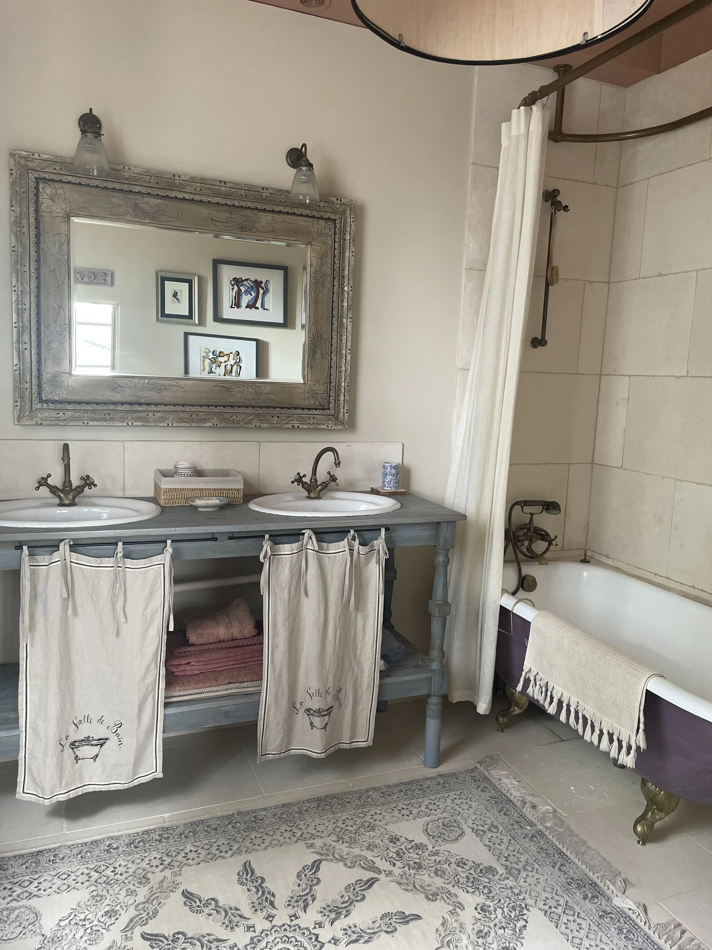 Vintage-style bathroom with a double sink vanity, ornate framed mirror, towels hanging, wall art, a clawfoot bathtub with a curtain, and a decorative rug.