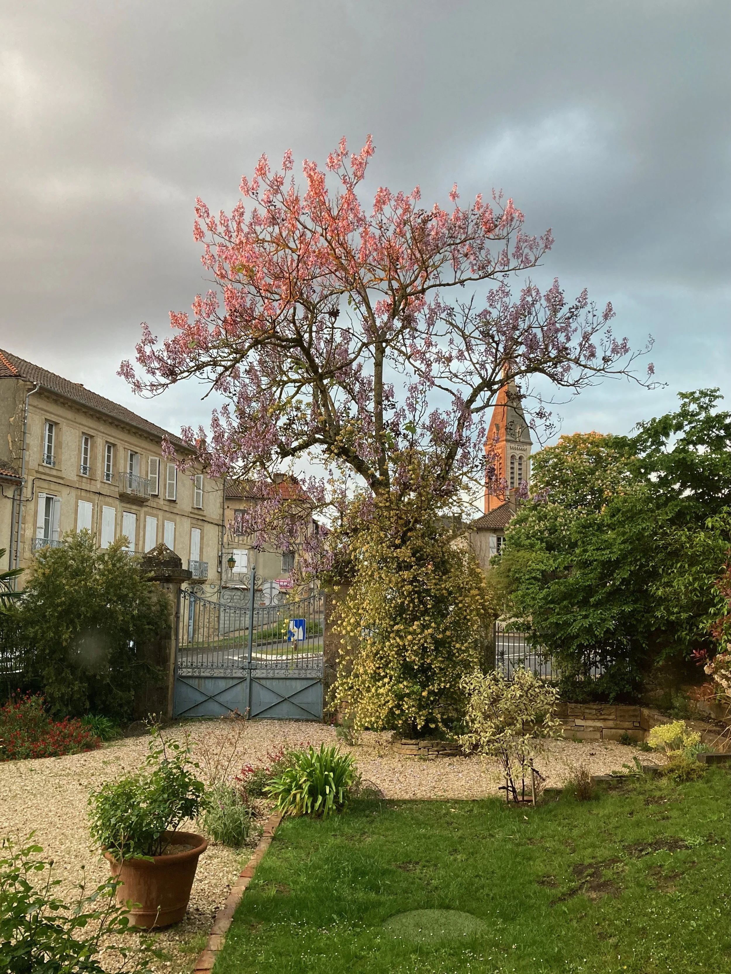 Tree with pink and purple blossoms in a garden, with a gravel path and green lawn, surrounded by rustic buildings and a church tower in the background under a cloudy sky.