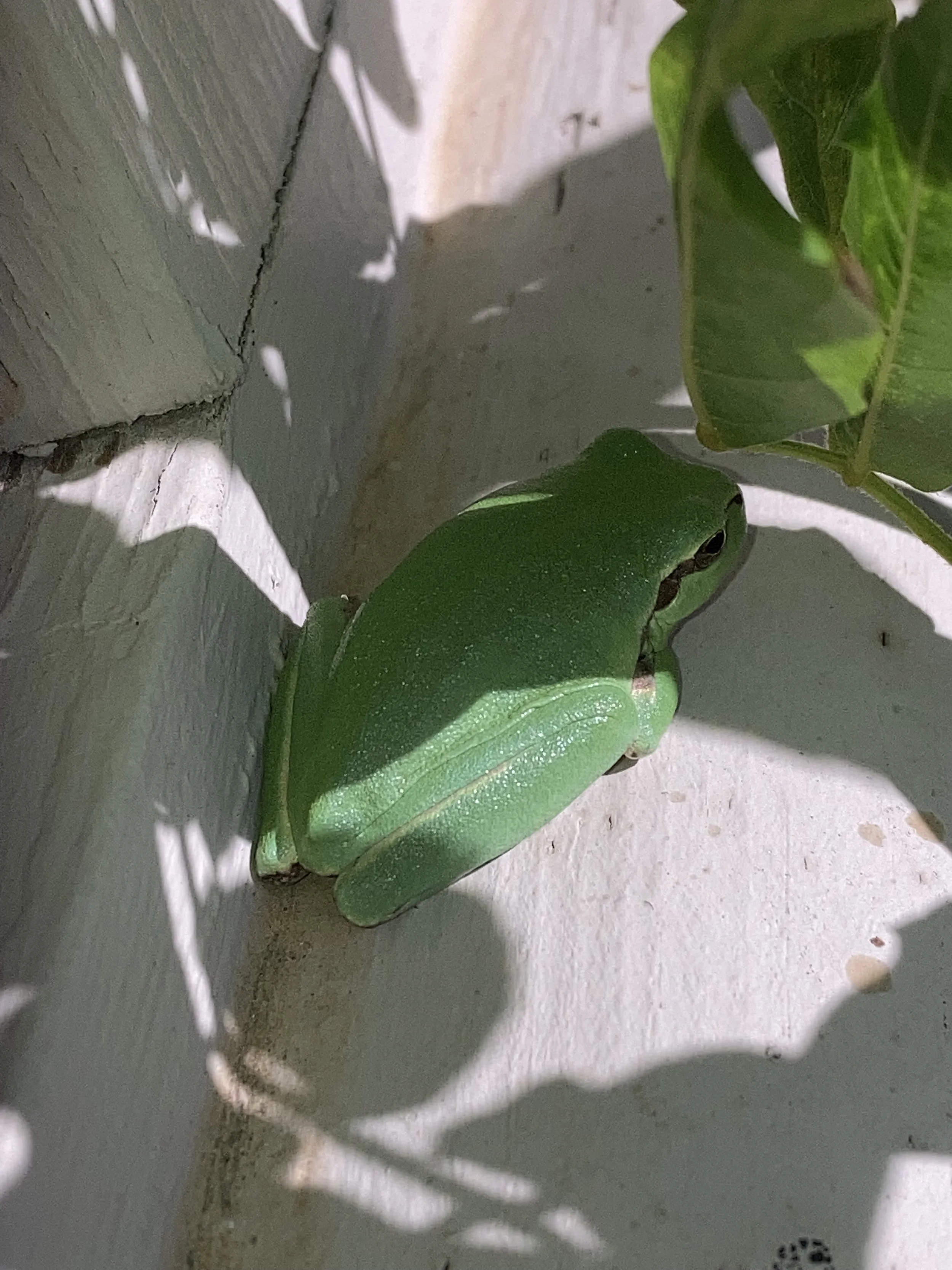 Green tree frog resting on a white surface next to a plant. View fullsize