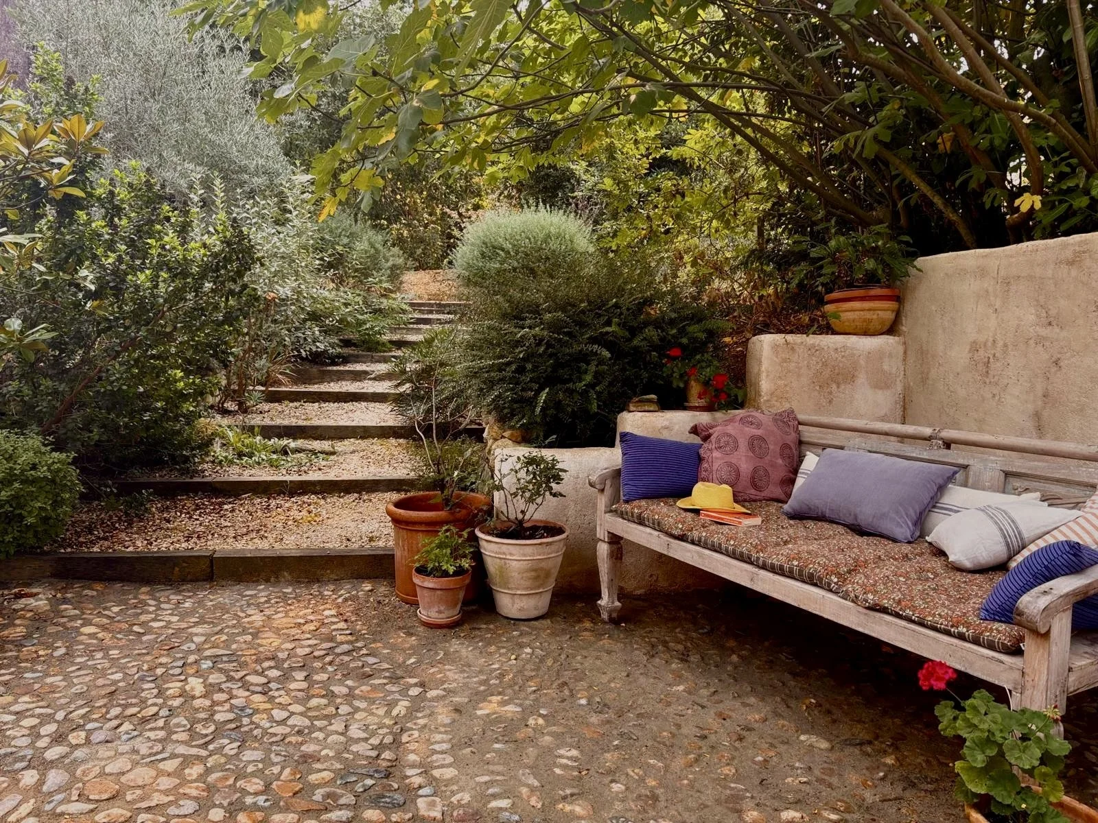 A cozy outdoor garden seating area with a wooden bench with colorful pillows, potted plants, and a stone staircase leading up through lush greenery. View fullsize