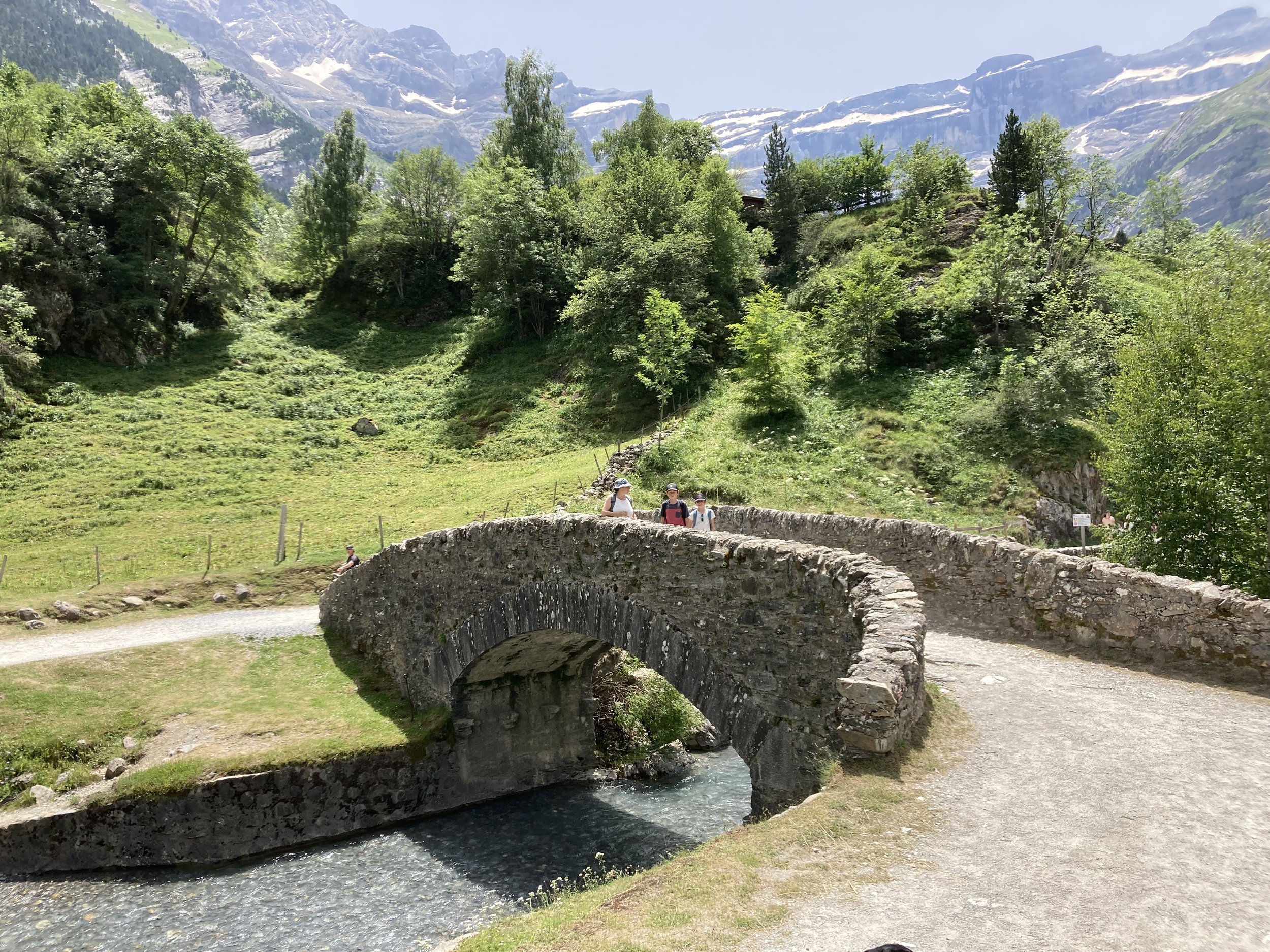 Stone arch bridge over a small river in a mountainous landscape with lush greenery and distant snow-capped peaks.